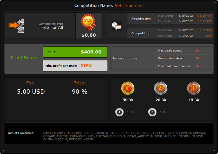 Registration for Profit Hunters2 has already started. Profit Hunters2 is a 2-week Forex trading contest. To join the contest, a small entry fee is required ($5). The total prize money fund consists of the entry fees paid by all participants. Apart from that, FXOpen offers a $400 bonus on top of the total prize money fund.